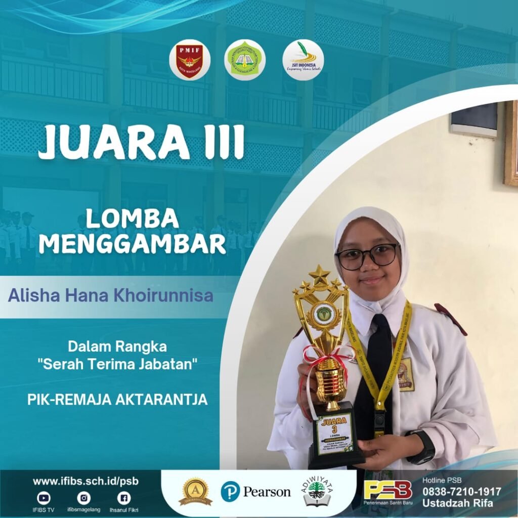 Magelang, 24 Februari 2025 – Alisha Hana Khoirunnisa, santri dari Pesantren Modern Ihsanul Fikri Kota Magelang, berhasil meraih juara 3 dalam lomba menggambar poster anti-bullying yang diselenggarakan dalam rangka kegiatan REMAJA AKTARANTJA di SMPN 1 Magelang. Alisha, yang merupakan siswa kelas 8C, mengangkat tema pentingnya kepedulian terhadap sesama dan perlunya menghentikan tindakan bullying di lingkungan sekitar.